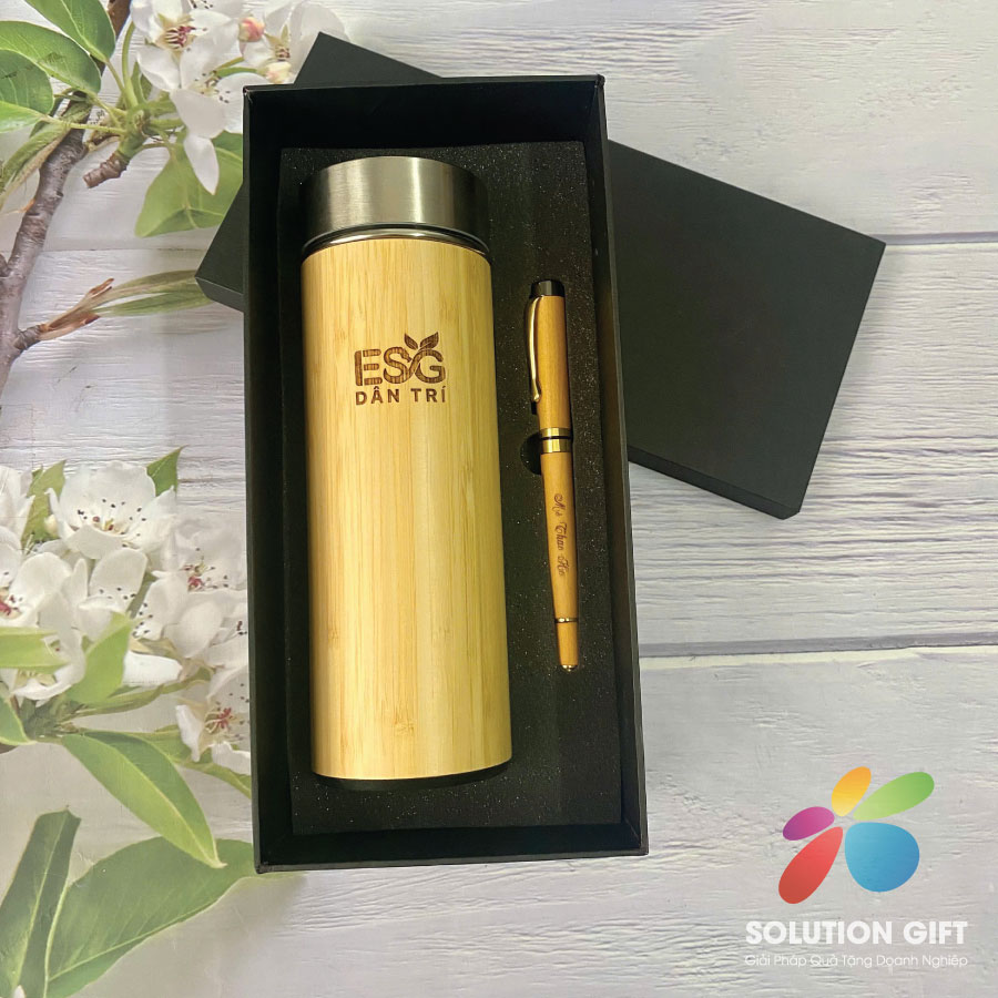 Sự kết hợp giữa bình giữ nhiệt và bút in logo tạo nên món quà vừa hiện đại vừa thiết thực.